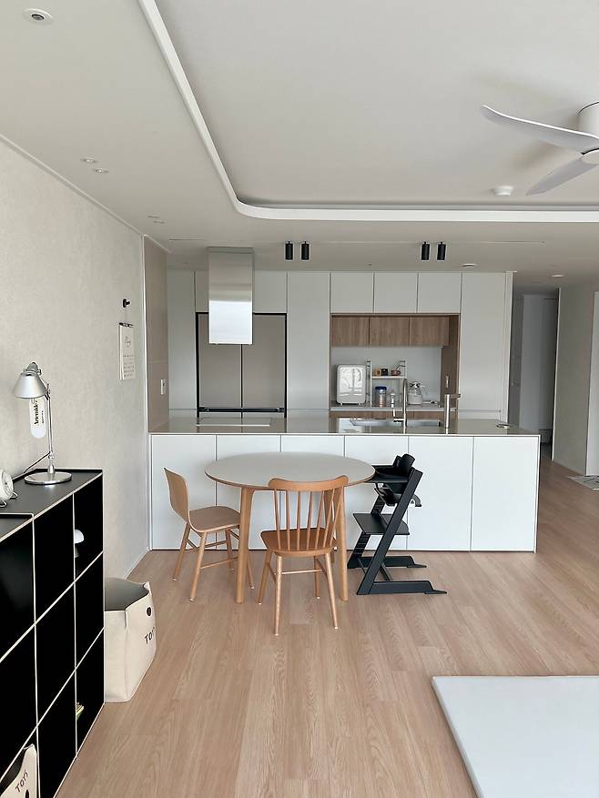 하지만 걱정되는 점은 싱크대가 주방 끝 쪽 구석에 위치하고 있어서 소통에 다소 불편함을 겪을 수 있겠다는 거였어요. 아기와 함께하는 시간이 많다 보니 대면형 주방 시공은 필수적이라는 생각이 들었습니다. 그리고 시공의 결과는 정말 만족스러워요. 전체 인테리어를 통틀어서 대면형 주방이 가장 잘한 점이 아닐까 싶을 정도로요.