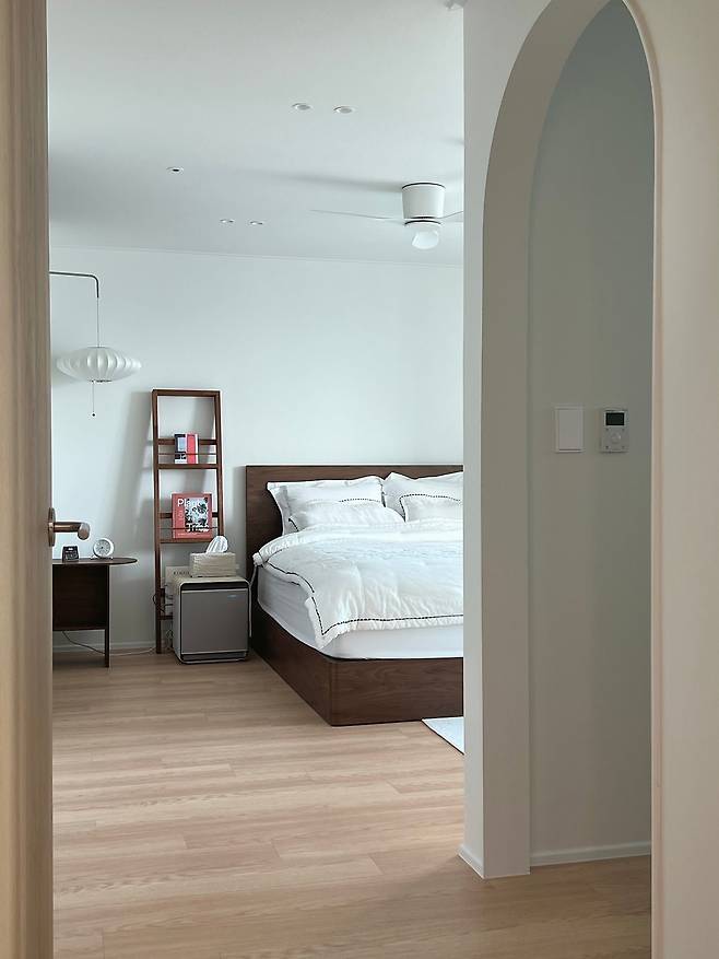 또 방의 조명은 2인치 다운라이트로 설치해 주었어요. 편안히 쉬는 곳인 만큼 눈부심을 방지하기 위해 확산형 타입으로 시공하려고 했답니다. 또 거실보다 약간 작은 실링팬을 시공했는데 자기 전에 틀어두면 너무 좋아요. 여름에 시스템에어컨보다 더 자주 활용하고 있습니다.