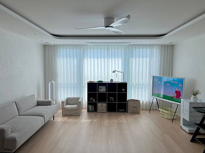 그럼 거실부터 소개해 드릴게요. 여긴 가족이 전체적으로 소통할 수 있는 공간으로 꾸미게 되었는데요. 특히 아기와 함께 대부분의 시간을 보내는 공간이라 알록달록한 아기용품이 늘 함께하지만 아기 책장은 블랙으로, 아기 소파는 화이트로 맞춰 공간이 깔끔하게 보일 수 있도록 했습니다.