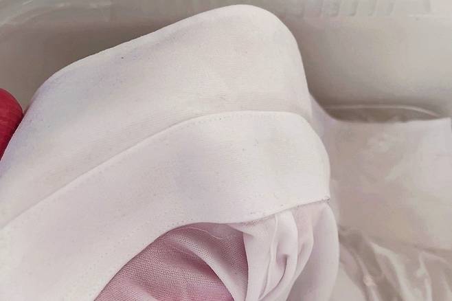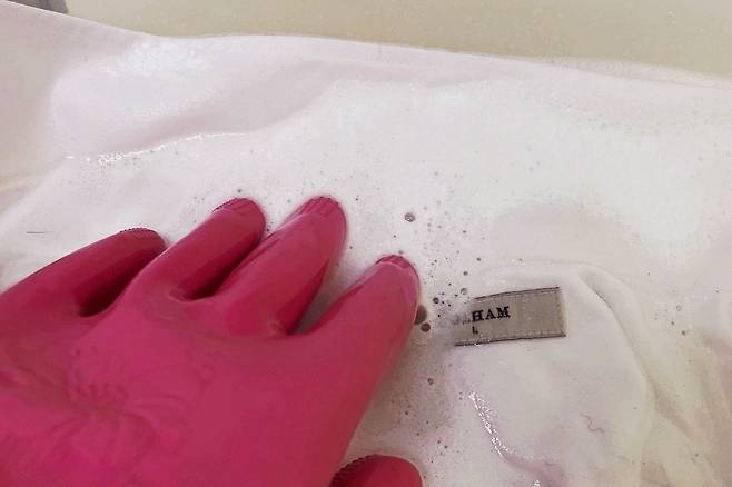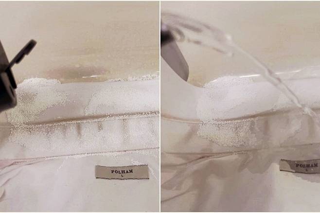 방법은 넓은 볼에 남방을 넣고 목때 부분에 과탄산소다를 넉넉히 뿌려주세요. 그다음 팔팔 끓인 뜨거운 물을 천천히 부어줍니다.