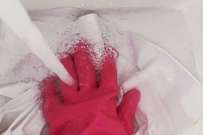 물에 폭 잠기게 해 주세요. 이때 가스 발생하니 환기하시고 꼭 고무장갑 착용하세요