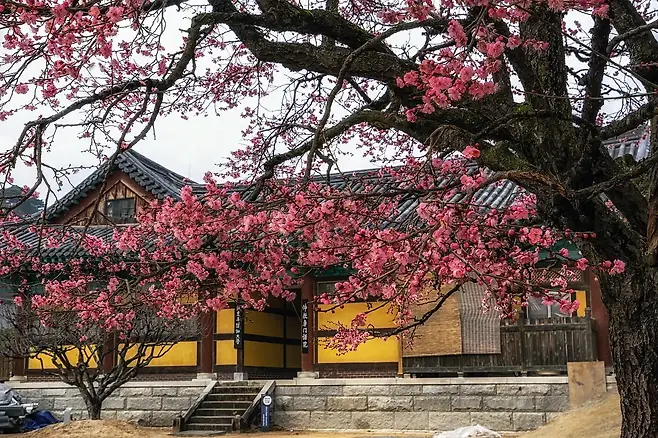 통도사를 찾으면 대웅전을 비롯한 여러 문화재도 함께 둘러볼 수 있습니다. 대광명전이나 일주문 같은 사찰 건축물을 관람하고, 무풍교에서 일주문까지 이어지는 소나무 길을 걷는 것도 놓치기 아쉬운 체험입니다. 이 길에서 바라보는 홍매화는 색감이 한층 도드라져, 사진으로 기록하기에도 좋습니다.