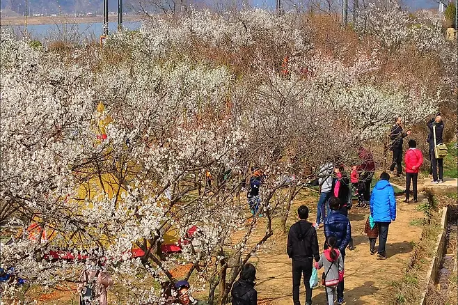 양산 원동면에 위치한 순매원은 넓은 매실농원으로, 매년 이맘때가 되면 수많은 매화가 흐드러지게 피어납니다. 낙동강과 철길이 어우러지는 독특한 뷰 포인트 덕분에 사진 애호가들에게 특히 사랑받는 명소로 자리 잡았습니다. 전망대에서 내려다보는 매화 밭과 기차가 지나가는 순간의 풍경은 인생샷을 남기기에 충분합니다.