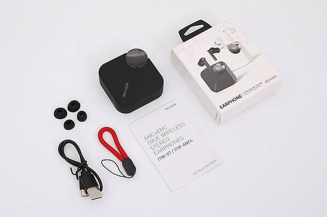 구성품으로는 이어폰이 수납되어 있는 충전 케이스와 여분의 이어팁, 스트랩, 충전용 USB 케이블, 그리고 사용 설명서가 제공된다.