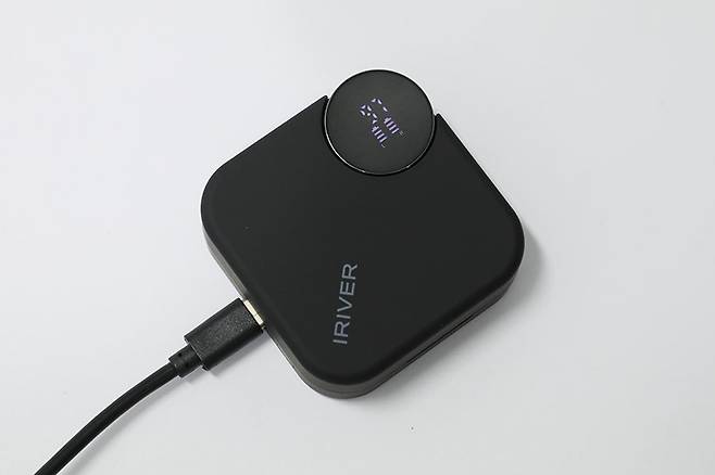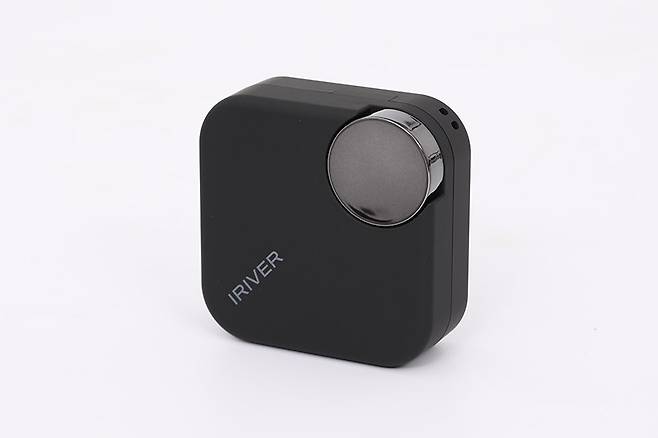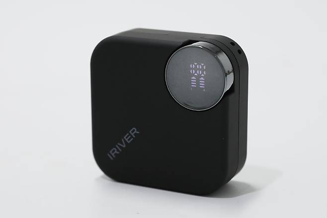 충전 케이스는 네 모서리가 둥글게 처리된 박스 타입으로, 윗면에 제조사 브랜드 로고 인쇄와 원형의 포인트가 삽입되어 있다.