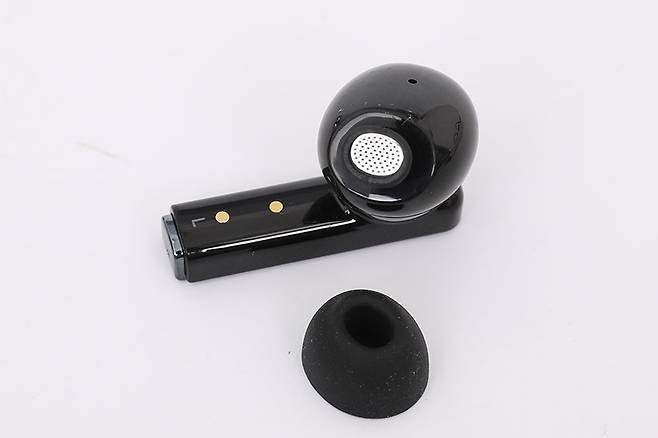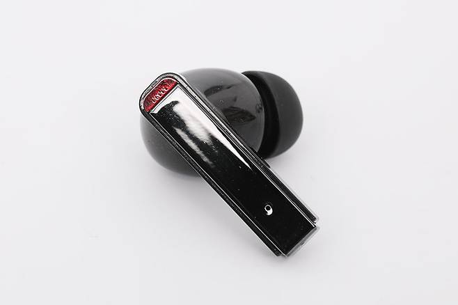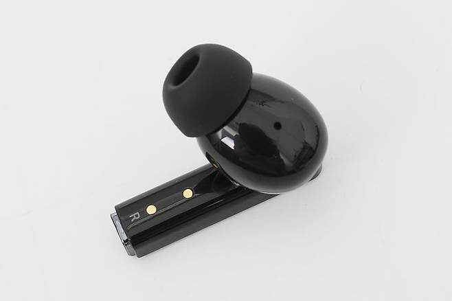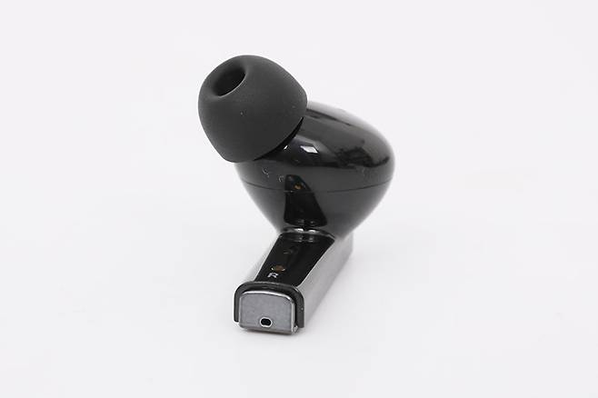 이어폰의 다리 부분 안쪽 면에는 충전 시 포고핀과 접촉하는 금속 접점 두 개가 보이고, 그 아래로 좌우 표시가 인쇄되어 있다. 또한 이어팁 바로 뒤 하우징에는 내부의 이압을 줄여주는 용도의 덕트가 뚫려 있는 것도 확인할 수 있다.