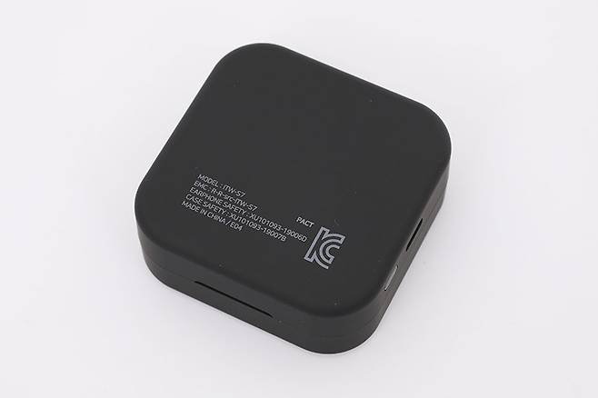 충전 케이스 뒷면에는 모델명과 인증 정보 등이 인쇄되어 있다.