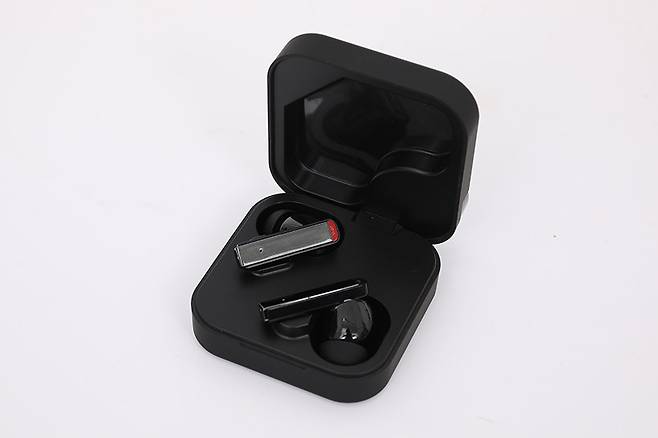 충전 케이스를 열어보면 좌우 이어폰이 대각선 방향에 가지런히 거치되어 있으며, 충전 케이스 내부에는 이어폰의 좌우 표시는 보이지 않는다.