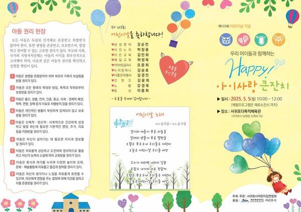 제103회 어린이날을 기념하는 행사가 곳곳에서 열리는 가운데 제주시는 한라체육관 '대축제', 서귀포시는 공천포전지훈련센터 다목적체육관에서 '큰잔치'를 개최한다.