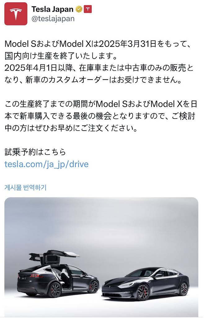 지난 6일 테슬라 재팬은 공식 채널을 통해 2025년 3월 31일부로 모델S와 모델X의 신규 주문을 종료한다. 4월 1일부터는 재고차 또는 중고차만 판매되며, 신차 주문은 더이상 할 수 없다"고 밝혔다.