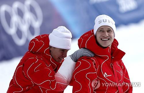 epa12726636 Gold medalist Franjo van Allmen (L) of Switzerland and bronze medalist Marco Odermatt of Switzerland celebrate after the Men's Super G of the Alpine Skiing competitions at the Milano Cortina 2026 Winter Olympic Games, Stelvio ski centre in Bormio, Italy, 11 February 2026. EPA/GUILLAUME HORCAJUELO