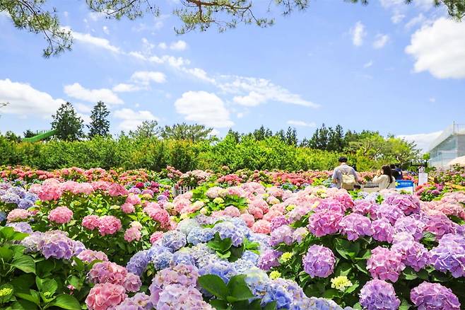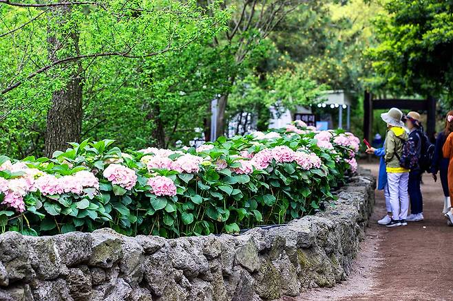 봄바람을 타고 제주를 찾은 여행자들이 입을 모아 감탄하는 관광 명소, 바로 서귀포시 남원읍에 자리한 ‘휴애리 자연생활공원’의 수국정원이다.