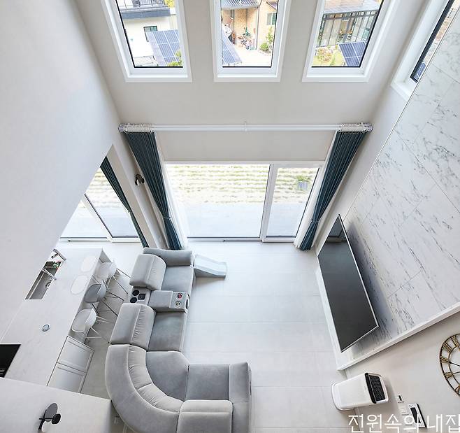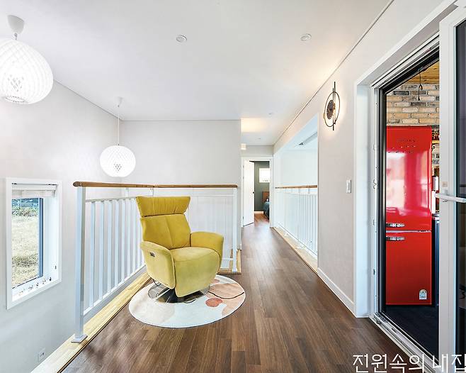 오픈 천장으로 설계된 1층엔 거실과 주방, 게스트룸을 배치했고 2층엔 마스터룸과 욕실, 드레스룸, 포치를 두었다. 2층 복도 공간을 활용해 부부가 휴식을 취하고 간단한 취미 활동, TV 시청을 할 수 있는 가족실 공간도 만들었다.