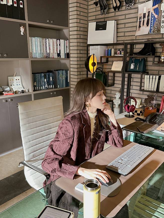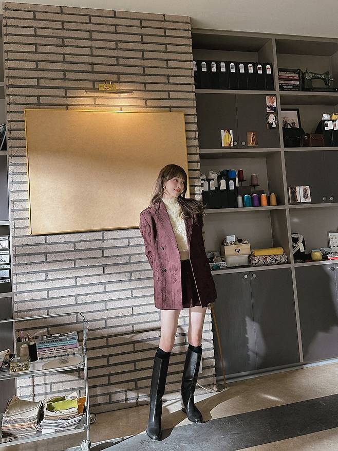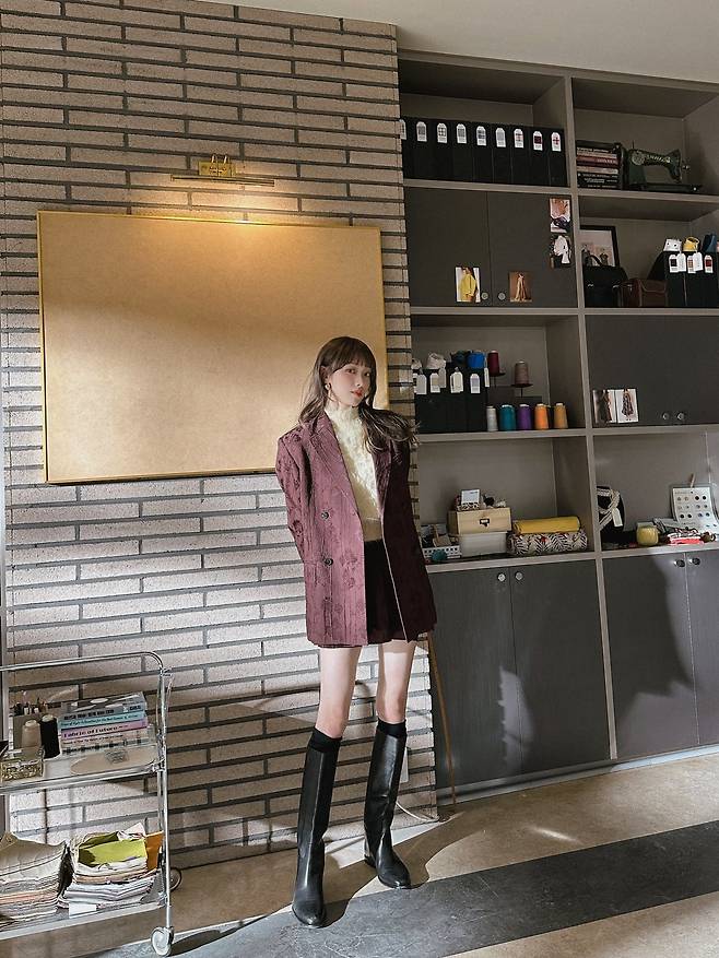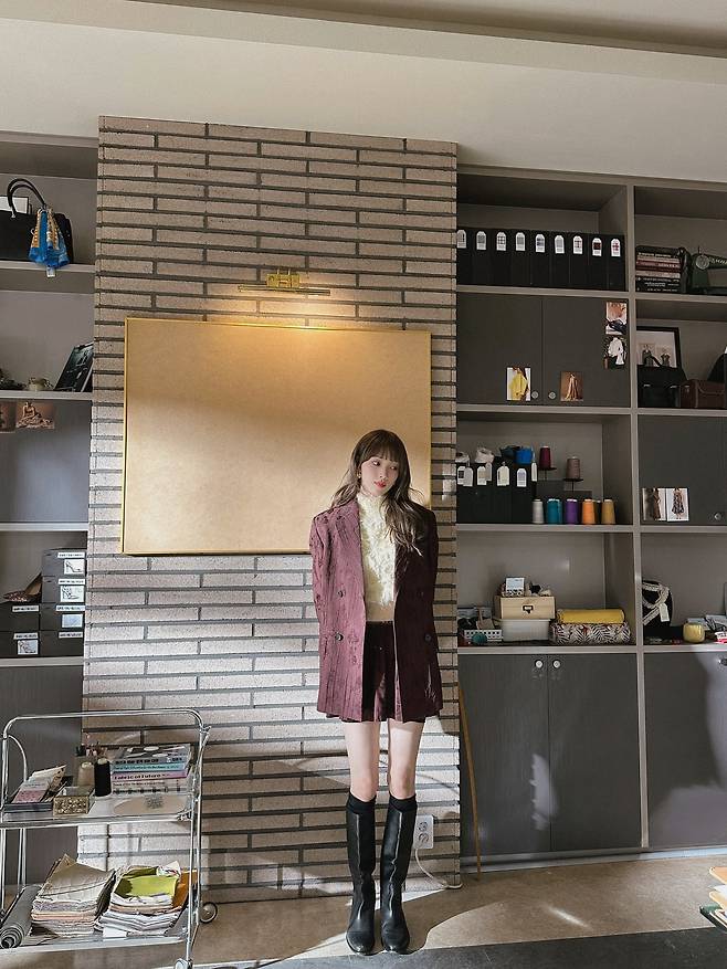 특히 무릎 위까지 올라오는 긴 검은색 가죽 부츠는 그녀의 독보적인 다리 길이를 더욱 강조하며, 클래식한 셋업 차림에 현대적이고 당당한 카리스마를 불어넣는 완벽한 포인트가 됩니다.