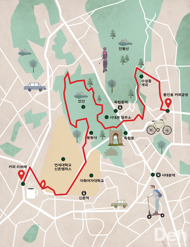 안산 자락길과 인왕산 자락길을 달리며 스페셜티 커피를 마실 수 있다. 경사가 비교적 완만해 러닝 초심자들에게도 부담이 적다. 남산서울타워나 한양도성 순성길 등을 한눈에 볼 수 있어 즐겁다.