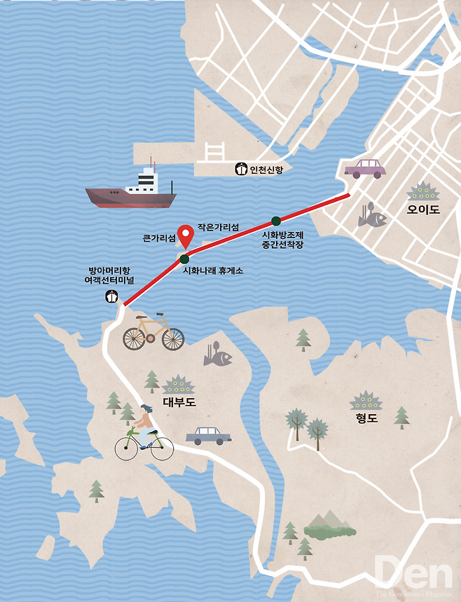 시화나래휴게소 → 대부도 방면 방조제 왼쪽 끝 → 시화나래휴게소 → 오이도 방면 방조제 오른쪽 끝 → 시화나래휴게소