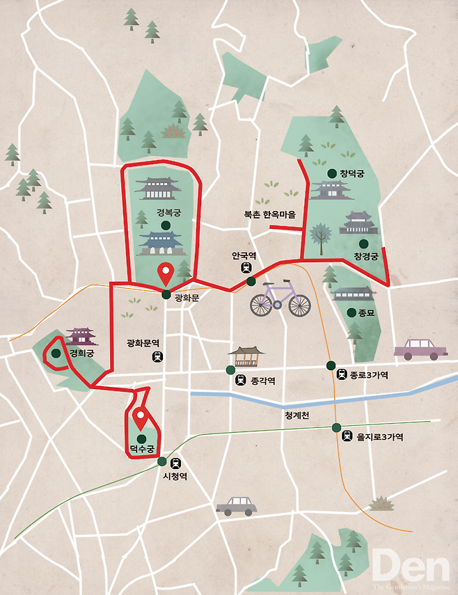 광화문 → 경복궁 1회전 → 창덕궁 → 창경궁 → 광화문 → 경희궁 → 덕수궁