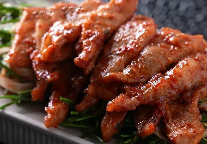 – 팬을 센불로 예열한 뒤 항정살을 올려 구워.