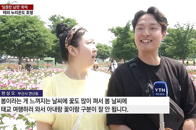 지난 11일 YTN 뉴스는 경남 함안에서 푸른 보리와 작약꽃이 만개해 봄나들이객의 눈길을 사로잡았다고 보도하며 한 신혼부부와 인터뷰를 진행했습니다.