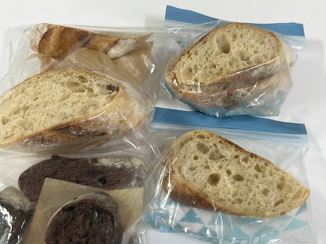 양이 많은 빵도 이렇게 소분하여 냉동실에 보관하면 두고두고 먹을 수 있습니다. 최대 2~3주 간 보관이 가능하며 토스트기나 에어프라이어로 해동하면 갓 산 빵처럼 맛있습니다.