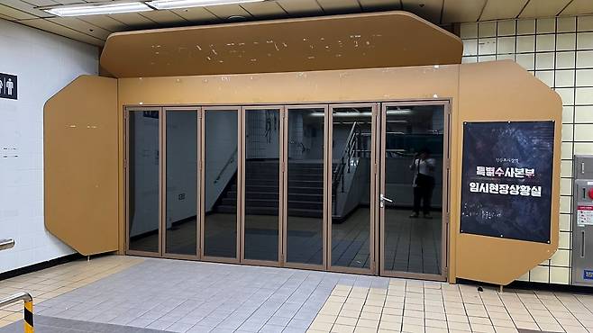 헬스테이션의 입구. 영등포 시장역 유령 승강장에 발생한 수수께끼의 사건을 해결하기 위해 마련된 '특별수사본부 임시현장상황실'이라는 설정입니다.