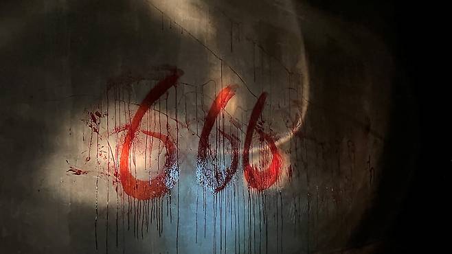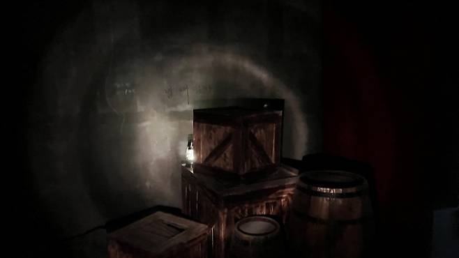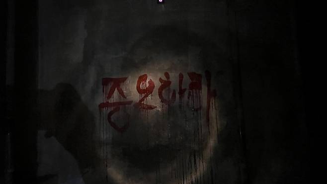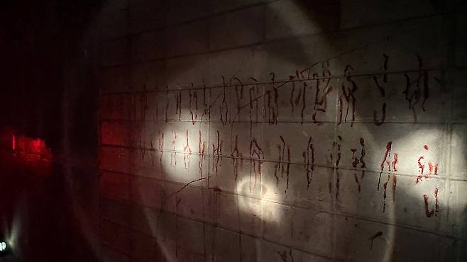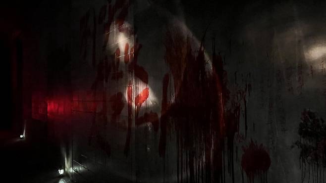 곳곳에 피로 그려진 듯한 오싹한 문양이나 글귀가 적혀 있었습니다. 관이나 정체불명의 고깃덩이 같은 것도 있었고요. 게임에 나오는 문양 사이로 한국어가 적혀 있으니 신기하기도 했습니다.