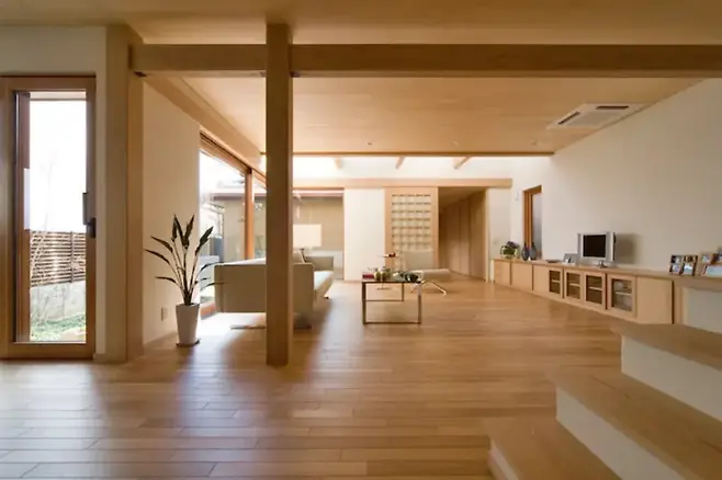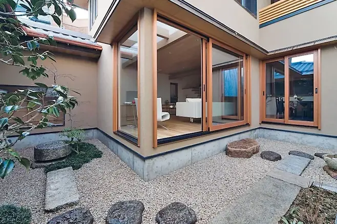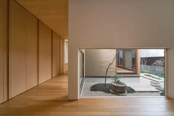 좁은 부지 조건에서 ‘빛의 여백’을 창조하는 방법으로 중정을 거실과 연결하는 구조가 특징적이다. 커다란 유리창 너머로 중정의 녹음이 현실을 잊게 만든다.