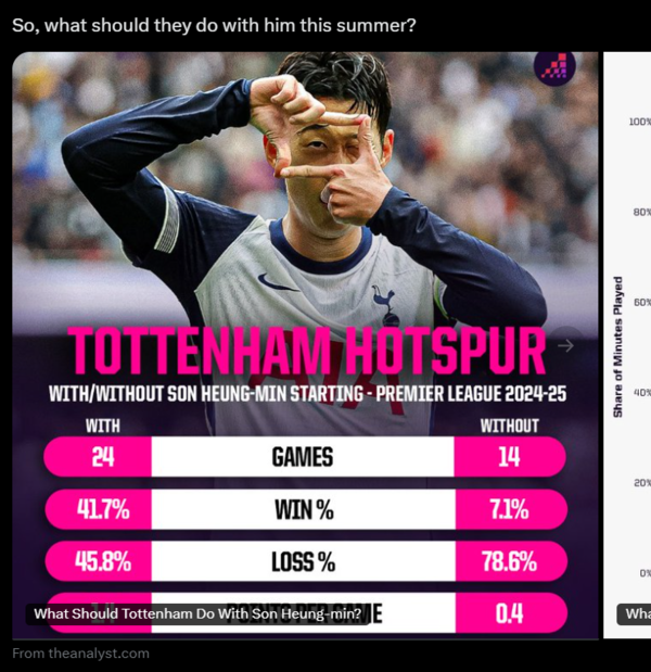 축구 통계 업체 ‘옵타’는 23일(한국시간) “토트넘은 손흥민 딜레마를 겪고 있다. 2024-25시즌 토트넘은 주장 손흥민이 선발로 나서지 않은 프리미어리그(PL) 14경기에서 단 1승만을 거뒀다”며 집중 조명했다.
