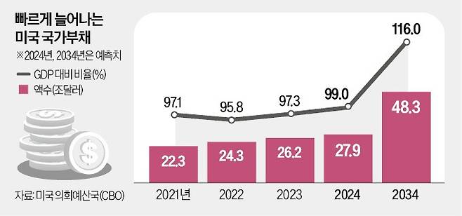 이는 미국 국가 부채가 급증하고 있기 때문이다. 미 의회예산국(CBO)에 따르면 지난해 말 기준 미 연방정부의 부채 부담은 26조2000억달러(약 3경6000조원)에 달한다. 2년 새 3조9000억달러 늘어난 것으로 미국 GDP의 97.3%다. CBO는 GDP 대비 국가 부채 비율이 올해 99.0%, 내년 101.7% 늘어날 것이라고 예측했다. 국가 부채는 그 뒤로도 빠르게 늘어 2034년엔 4조8300억달러로 GDP 대비 116.0%까지 확대될 것으로 전망된다.
