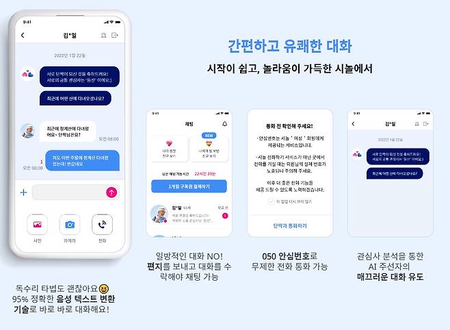 네. ‘시놀’ 곳곳에는 시니어 이용자를 위한 세심한 배려가 있습니다. 먼저 글자와 버튼 크기는 쉽게 보고 누를 수 있도록 확 키웠습니다. 채팅 작성이 힘든 이용자를 위해 95%의 정확도로 음성을 문자로 변환하는 기능도 반영했습니다. 채팅 시작 시 인공지능(AI)이 매끄러운 대화를 위해 공통 관심사에 대한 질문을 던지기도 합니다.