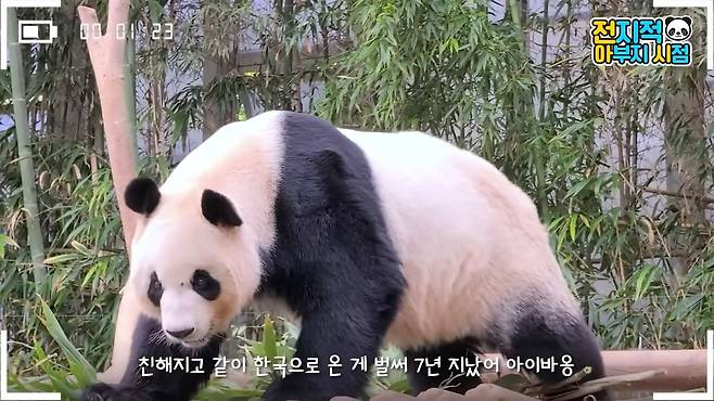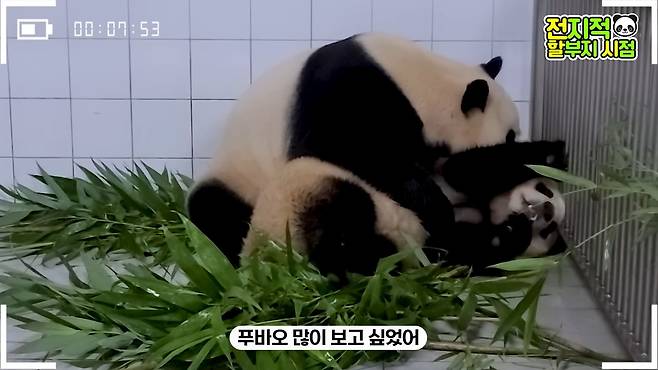 시간이 흘러 멋진 엄마 아빠가 된 러아 커플. 옛날을 회상한 강바오 할부지는 아이바오를 "아이바오가 나를 처음에 만났을 때 까칠하다고 생각을 했는데, 친해지고 같이 한국으로 온 게 벌써 7년이 지났어. 알겠니? 생각나 그때?" 라고 외쳤습니다.