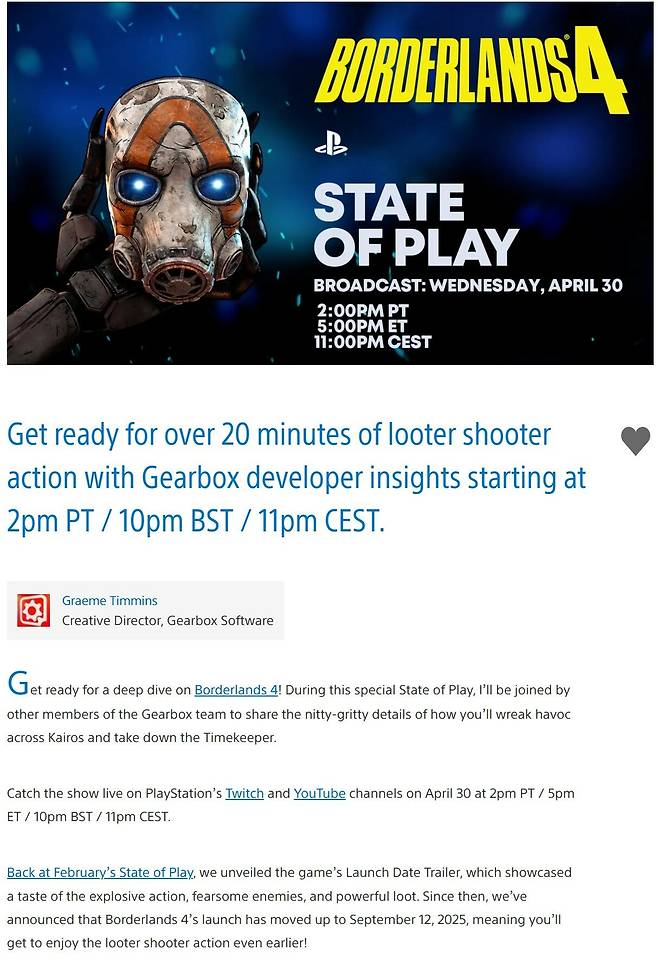 기어박스의 그램 팀민스 크리에이티브 디렉터는 현지 시각으로 29일, 플레이스테이션 공식 블로그를 통해 보더랜드4의 출시일을 한국 시간 기준 9월 13일으로 앞당긴다고 발표했다. 이와 함께 한국 시간으로 5월 1일, 스테이트 오브 플레이 딥다이브를 통해 보더랜드4에 대한 자세한 내용을 공개할 예정이다.