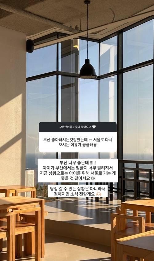 김지연은 "부산이 좋긴 하지만 아이 얼굴이 너무 알려져 있다"며 "지금 상황에서는 아이를 위해 서울로 가는 게 맞다고 생각한다"고 밝혔다.