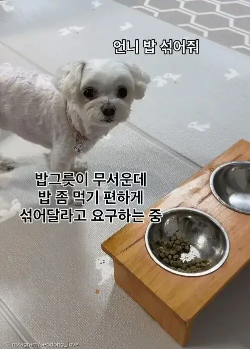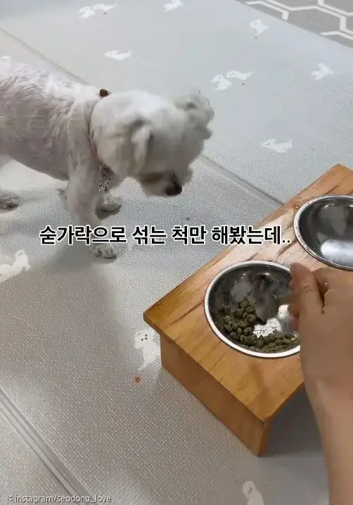보호자는 서동이가 낯선 그릇에 조금 불편해하는 눈치를 채고는 장난기 가득한 손놀림으로 사료를 섞는 척만 해봤다. 숟가락을 허공에 휘젓기만 했을 뿐, 실제로는 아무것도 섞이지 않았다.