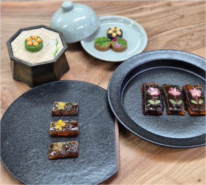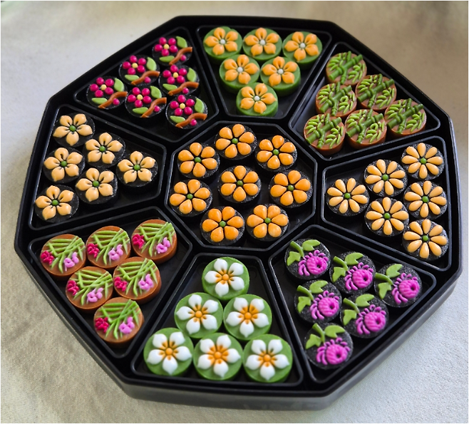 A. 흑임자꽃다식이 가장 인기가 많아요. 고급스러운 보자기 포장도 가능해요.