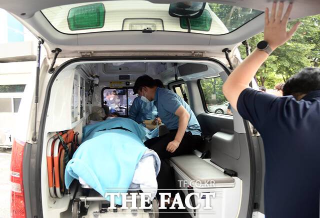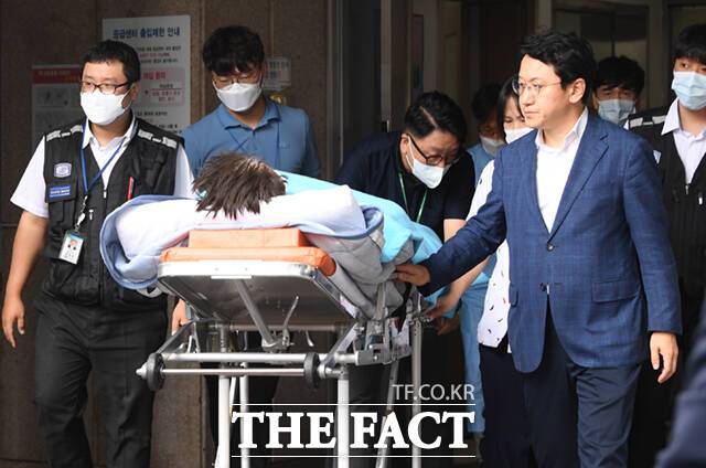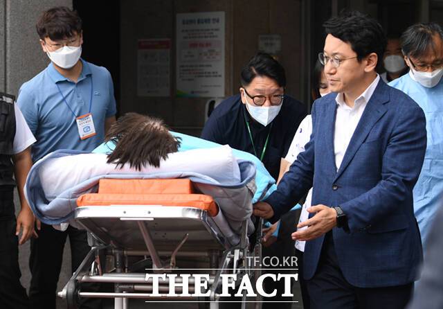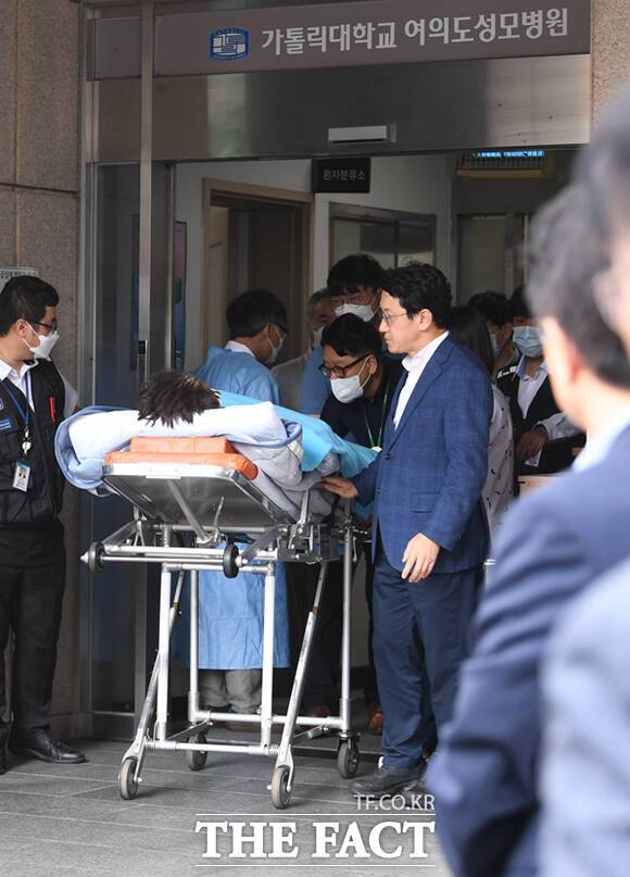 [더팩트ㅣ이새롬 기자] 무기한 단식을 벌이던 이재명 더불어민주당 대표가 건강 악화로 18일 오전 서울 여의도 성모병원 응급실에 긴급 이송, 치료를 위해 녹색병원으로 이동하고 있다. 대통령실의 국정 쇄신과 개각 등을 요구하며 단식에 들어간 지 19일 만이다.