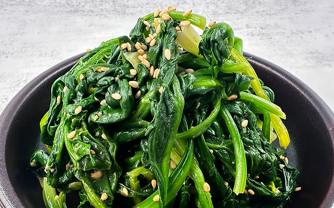 데친 시금치를 소금, 다진 마늘, 참기름으로 살짝 무쳐낸 시금치나물은 의사들이 자주 추천하는 녹색 채소 요리입니다. 하루 종일 쌓인 노폐물을 정리하고 간 기능을 도와주는 효과가 있으며, 철분과 엽산이 풍부해 피로 회복에도 좋습니다.