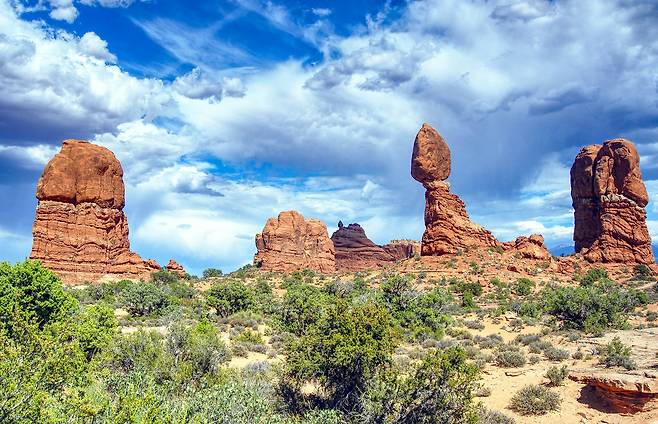 유타주 모압 근처, 붉은 사막 위에 기묘한 곡선의 천연 아치가 수천 개나 흩어져 있는 아치스 국립공원.