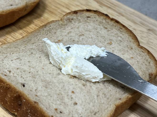 식빵은 토스트기에 구워서 크림치즈를 듬뿍 발라 주세요. 칼로리가 걱정된다면 그릭요구르트로 대체하여 발라도 됩니다.