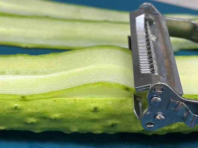 다른 재료 없이 오이만으로도 근사한 샌드위치 만들 수 있습니다. 먼저 오이는 굵은소금으로 박박 문지른 다음 필러로 얇게 썰어 주세요.