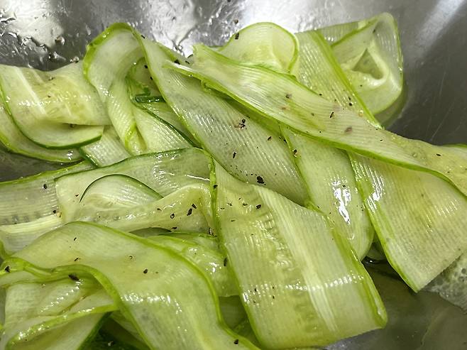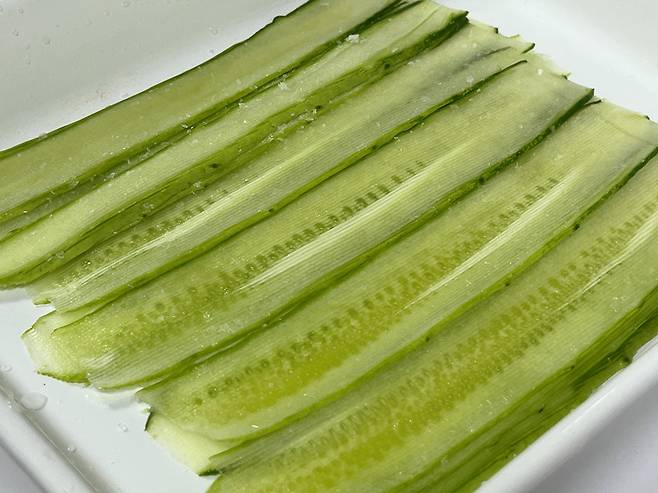오이는 겹겹이 평평하게 펼친 다음 소금을 뿌려서 살짝 절입니다. 그냥 오이를 쓰는 것보다 소금에 한 번 절이면 수분이 빠지면서 아삭한 식감이 살아납니다.