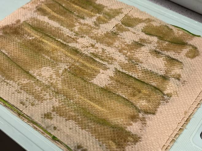 15분 정도 지난 다음 오이는 키친타월로 톡톡 두드려서 물기를 제거해 주세요. 손으로 꽉 짜면 모양이 다 망가지기 때문에 꼭 키친타월을 활용하세요.