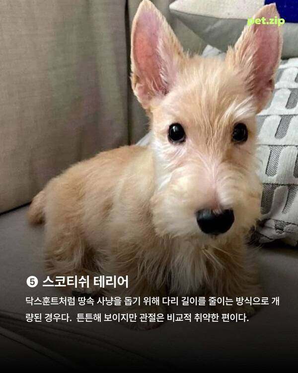 스코티시는 땅속의 사냥감을 잡기 위해 다리 길이를 줄이는 방식으로 개량된 견종입니다. 외형은 단단해 보이지만 다리 관절은 상대적으로 취약한 편으로 알려져 있습니다.