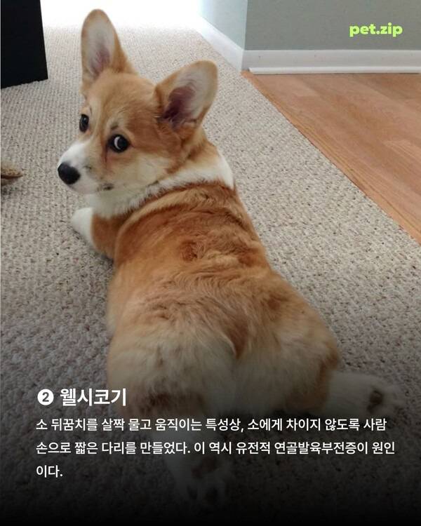 웰시코기는 소를 몰기 위해 뒤꿈치를 살짝 물고 움직이던 작업견으로, 소보다 낮은 위치에서 빠르게 움직일 수 있도록 짧은 다리가 개량되었습니다. 이 역시 유전적 연골발육부전증이 원인이며 현재까지 이어져 내려오는 대표 숏다리 견종입니다.
