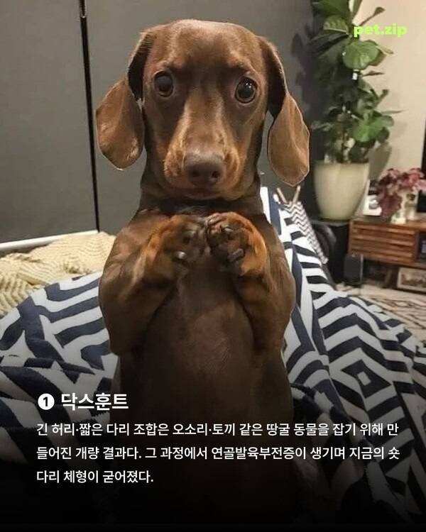 긴 허리와 짧은 다리 조합은 지상 가까이에 있는 오소리나 토끼 같은 동물을 잡기 위해 개량된 결과입니다. 이 과정에서 연골발육부전증이 나타나 지금의 독특한 체형이 만들어졌습니다.