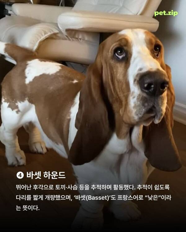 바셋 하운드는 뛰어난 후각을 활용하여 토끼나 사슴의 냄새를 추적하던 견종으로, 후각 활동에 집중할 수 있도록 몸을 낮추기 위해 다리가 짧게 개량되었습니다. ‘바셋(Basset)’이라는 이름 자체가 프랑스어로 ‘낮은’을 의미합니다.