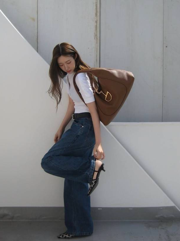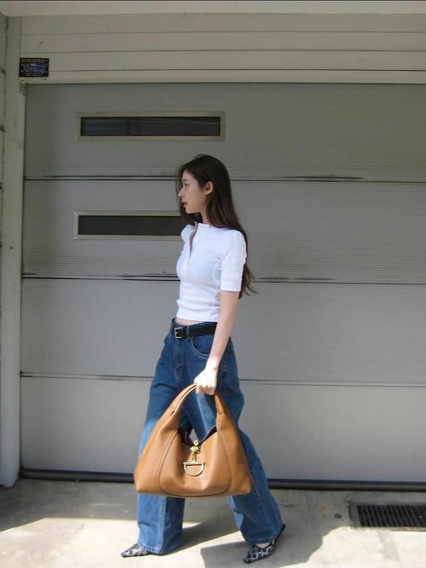 심플한 화이트 반소매 니트 톱에 워싱감이 살아있는 루즈핏 데님 팬츠를 매치해 깔끔하면서도 멋스러운 Y2K 감성을 연출했습니다.