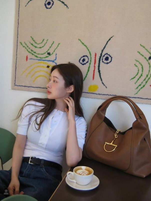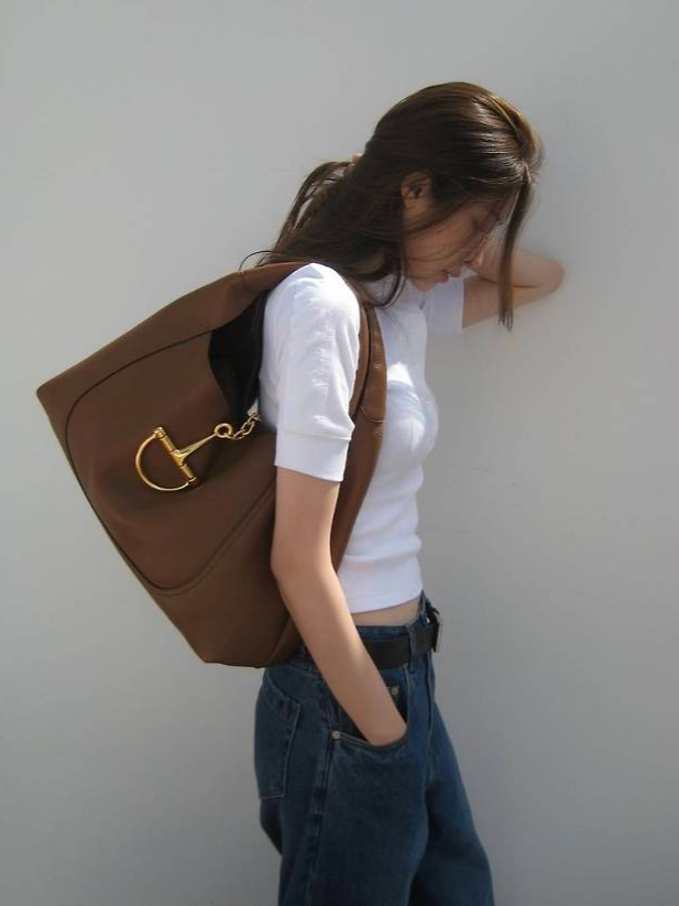 특히 허리를 살짝 조여주는 벨트 디테일로 실루엣에 포인트를 주고, 큼직한 브라운 호보백을 어깨에 걸쳐 스타일리시한 무드를 극대화했습니다.