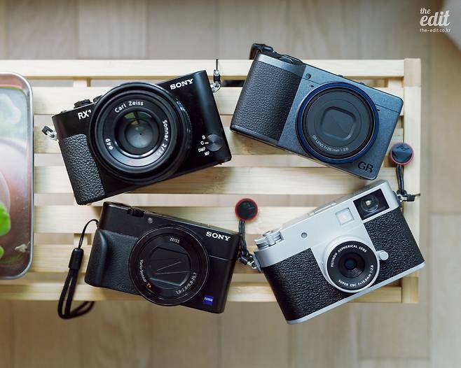 왼쪽 위부터 시계 방향으로 소니 RX1RII, 리코 GR IIIx, 후지 X-Half, 소니 RX100V.