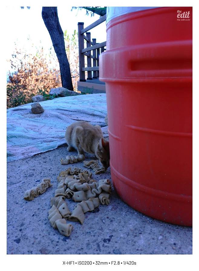 어묵에 정신이 팔린 길고양이를 꽤 가까운 거리에서 찍었지만 광각의 특성이 있는 렌즈 덕분에 조금 멀리 있는 것처럼 보입니다.